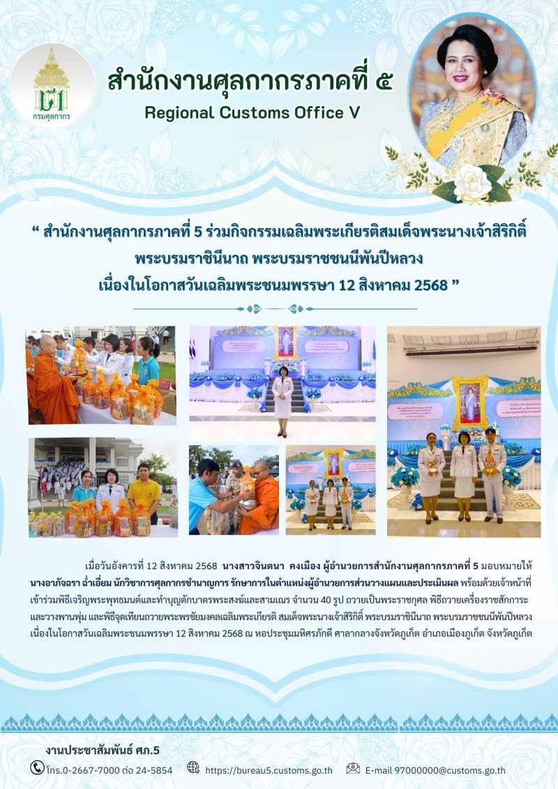 สำนักงานศุลกากรภาคที่ 5 ร่วมกิจกรรมเฉลิมพระเกียรติสมเด็จพระนางเจ้าสิริกิติ์ พระบรมราชินีนาถ พระบรมราชชนนีพันปีหลวง เนื่องในโอกาสวันเฉลิมพระชนมพรรษา 12 สิงหาคม 2568