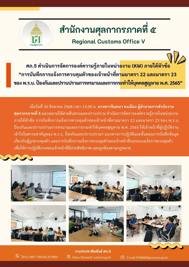 ศภ.5 ดำเนินการจัดการองค์ความรู้ภายในหน่วยงาน (KM) ภายใต้หัวข้อ "การบันทึกการแจ้งการควบคุมตัวของเจ้าหน้าที่ตามมาตรา 22 และมาตรา 23 ของ พ.ร.บ. ป้องกันและปราบปรามการทรมานและการกระทำให้บุคคลสูญหาย พ.ศ. 2565"