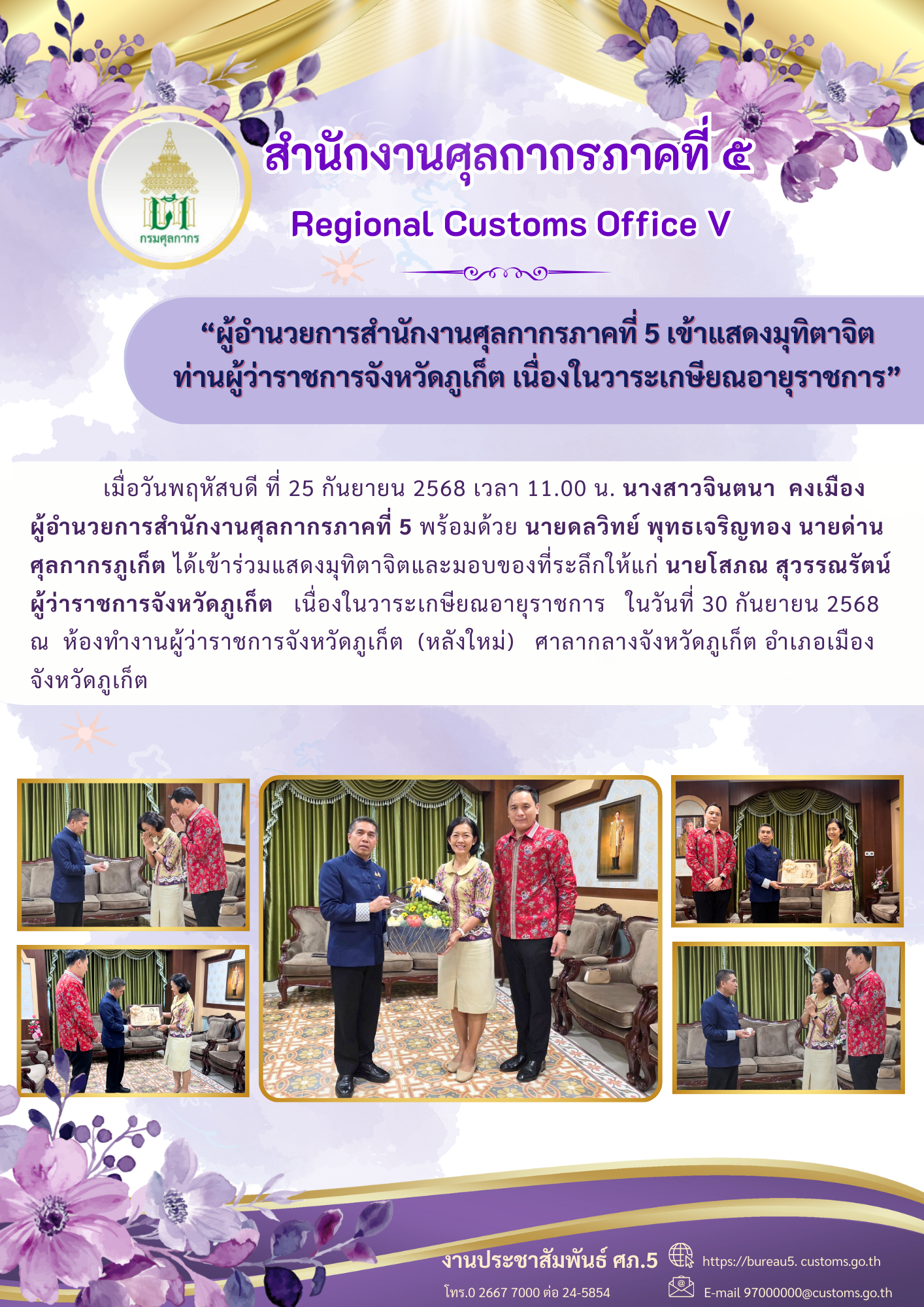 ผู้อำนวยการสำนักงานศุลกากรภาคที่ 5 เข้าแสดงมุทิตาจิต ท่านผู้ว่าราชการจังหวัดภูเก็ต เนื่องในวาระเกษียณอายุราชการ