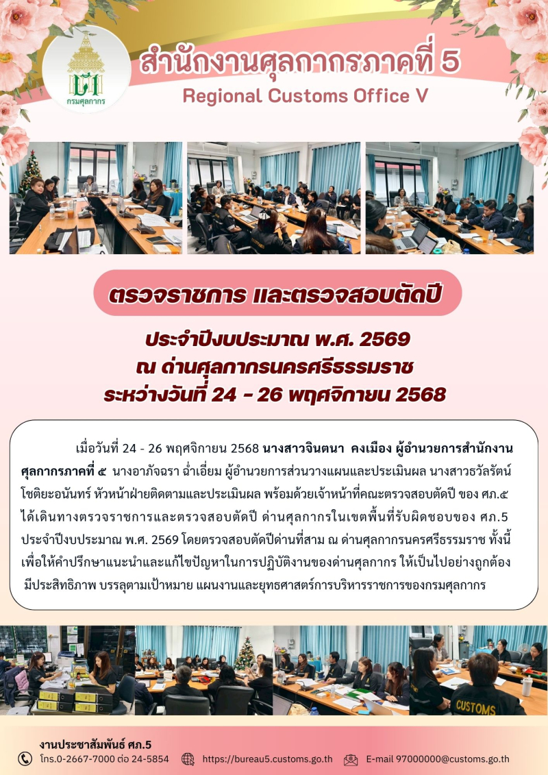 ตรวจราชการ และตรวจสอบตัดปี ประจำปีงบประมาณ พ.ศ. 2569 ณ ด่านศุลกากรนครศรีธรรมราช ระหว่างวันที่ 24 - 26 พฤศจิกายน 2568