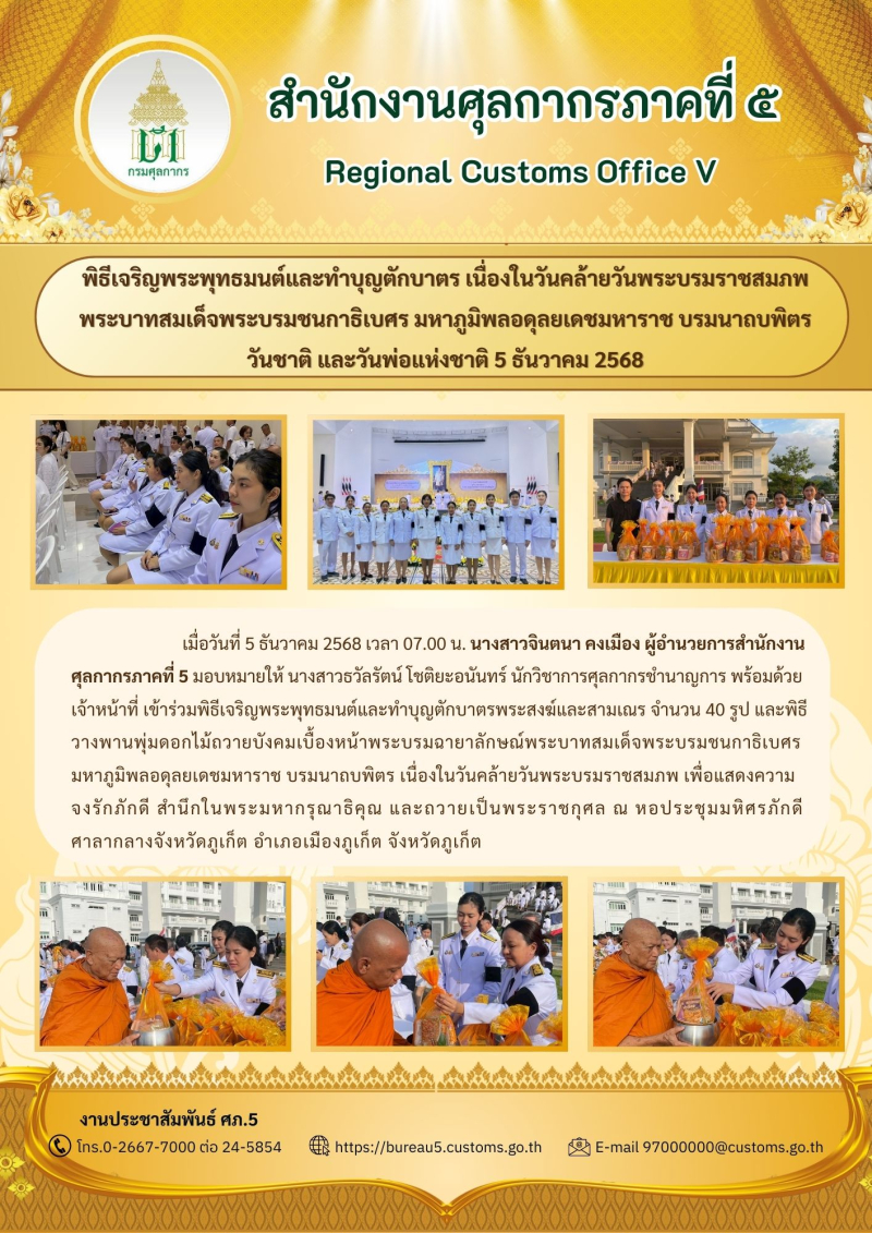 ศภ.5 เข้าร่วมพิธีเจริญพระพุทธมนต์และทำบุญตักบาตร เนื่องในวันคล้ายวันพระบรมราชสมภพ พระบาทสมเด็จพระบรมชนกาธิเบศร มหาภูมิพลอดุลยเดชมหาราช บรมนาถบพิตร วันชาติ และวันพ่อแห่งชาติ 5 ธันวาคม 2568