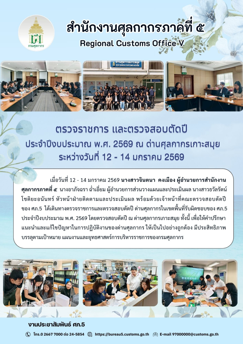 ตรวจราชการ และตรวจสอบตัดปี ประจำปีงบประมาณ พ.ศ. 2569 ณ ด่านศุลกากรเกาะสมุย ระหว่างวันที่ 12 - 14 มกราคม 2569