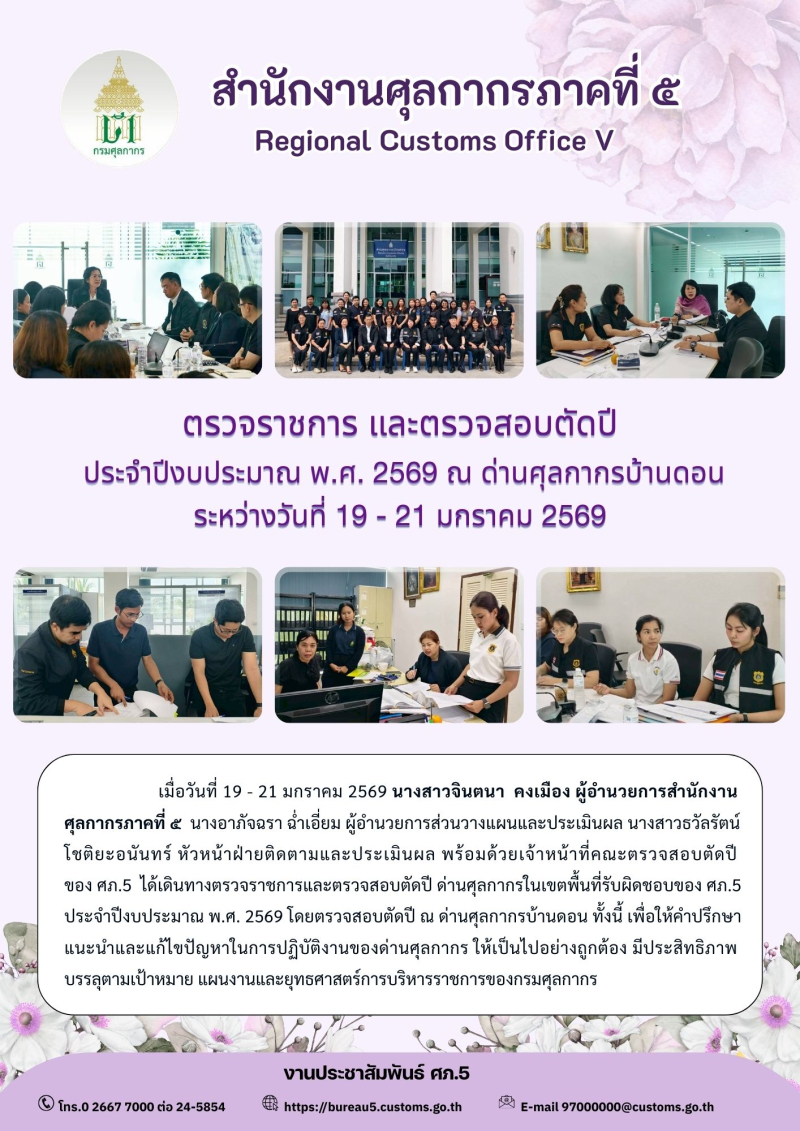 ตรวจราชการ และตรวจสอบตัดปี ประจำปีงบประมาณ พ.ศ. 2569 ณ ด่านศุลกากรบ้านดอน ระหว่างวันที่ 19 - 21 มกราคม 2569